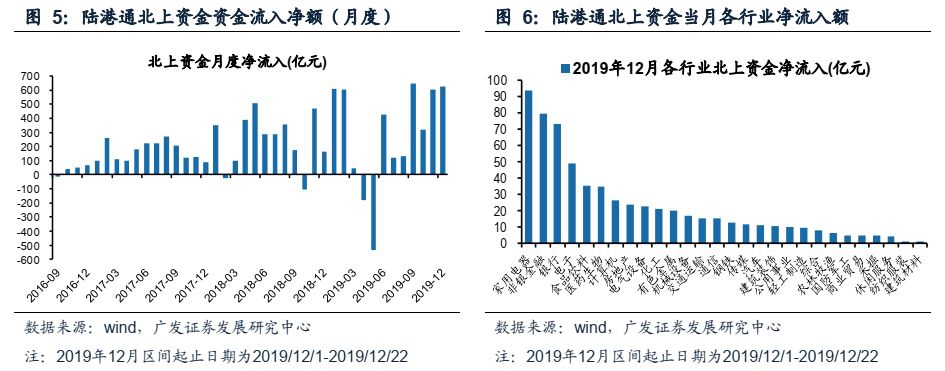 (5)陆港通北上资金流入净额:上周陆股通北上资金净流入212亿元,前一周净流入205亿元。12月(截至12月22日)北上资金净流入623亿元,净流入前五名行业是家电、非银金融、银行、电子、食品饮料,净流入后五行业是建材、纺服、休闲服务、采掘、商贸。