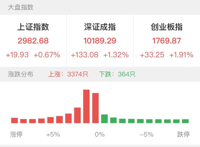 截至收盘,沪指上涨0.67%,收报2982.69点,深成指上涨1.32%,收报10189.29点,创业板指上涨1.91%,收报1769.87点。两市成交量4.43亿股。