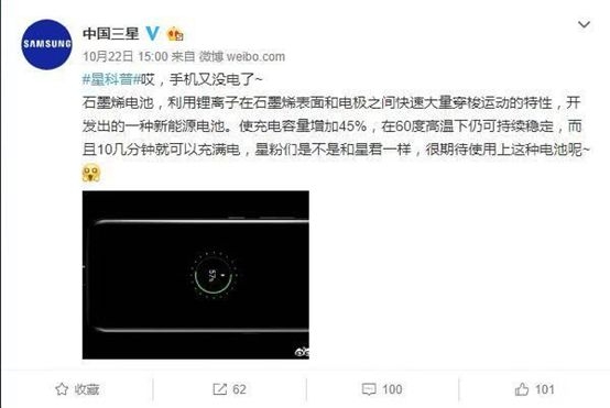 三星最早于明年推出石墨烯手机充满只需12分钟 据CNET报道,推特爆料大神Evan Blass(@Evleaks)今年8月称,三星希望明年或2021年至少有一部手机配备石墨烯电池。目前,三星正在提高石墨烯的产能,以及测试这款电池的耐用性。 2018年10月,三星在其官方微博上曾展示过自己的石墨烯电池,用户可以在12分钟就可以充满3000mAh+容量电池。