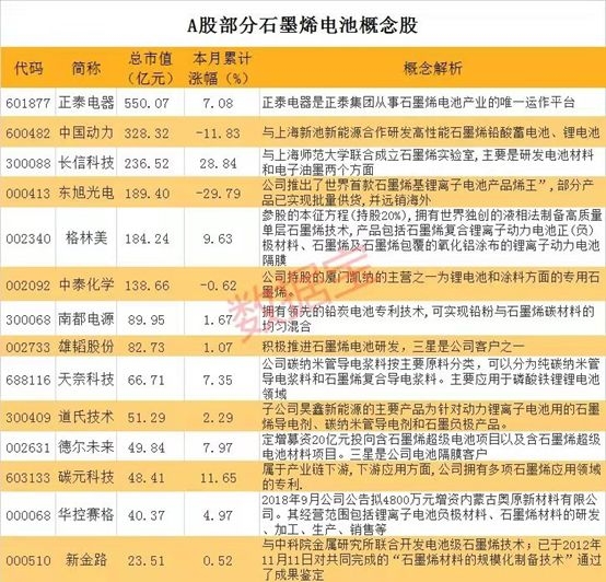 德尔未来年初至今已经上涨了28.16%。除了德尔未来,雄韬股份也曾表示公司正在积极推进石墨烯电池研发。虽然公司否认三星在这方面与其有合作,但是三星也是公司的客户之一。另外,道氏技术子公司的主要产品为针对动力锂离子电池用的石墨烯导电剂、碳纳米管导电剂和石墨负极产品。根据证券时报·数据宝统计显示,从市场表现来看,长信科技、碳元科技、格林美、德尔未来12月股价表现较好。其中,长信科技12月股价已累计上涨28.84%,今年下半年更是实现了股价翻番,公司与高校合作成立石墨烯实验室,研发电池材料和电子油墨。