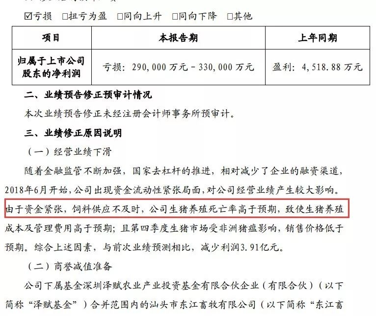 对于业绩修正原因,公司表示,2018年6月开始,公司出现资金流动性紧张局面,由于资金紧张,饲料供应不及时,公司生猪养殖死亡率高于预期,致使生猪养殖成本及管理费用高于预期;第四季度生猪市场受非洲猪瘟影响,销售价格低于预期。
