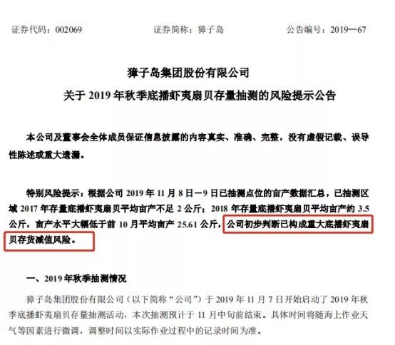 今年11月12日,獐子岛公告称,公司2019年11月8日-9日已抽测点位的亩产数据汇总,已抽测区域2017年存量底播虾夷扇贝平均亩产不足2公斤;2018年存量底播虾夷扇贝平均亩产约3.5公斤,亩产水平大幅低于前10月平均亩产25.61公斤,公司初步判断已构成重大底播虾夷扇贝存货减值风险。