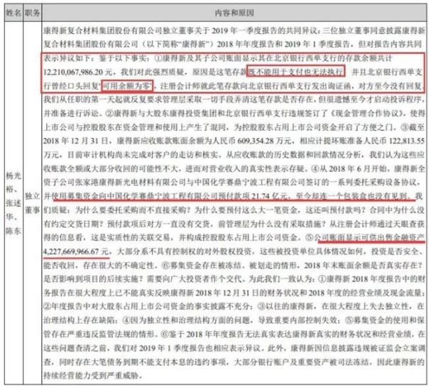 康得新2018年年报显示,其货币资金余额为153.16亿元,其中122.1亿元为银行存款余额。不过,审计机构、公司独董均对此表示不能判断真实性。因这笔存款既不能用于支付也无法执行,并且所存银行曾经口头回复“可用余额为零”。