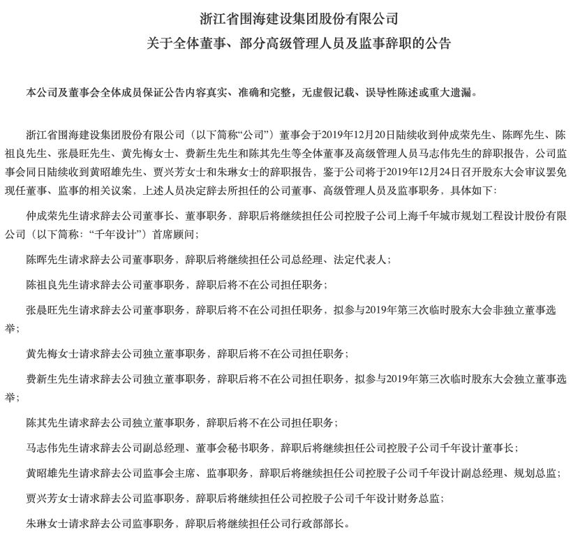 12月20日晚间,ST围海公告称公司董事会于当日陆续收到仲成荣、陈晖、陈祖良、张晨旺、黄先梅、费新生和陈其等全体董事,以及高级管理人员马志伟的辞职报告,公司监事会同日陆续收到黄昭雄、贾兴芳和朱琳的辞职报告。