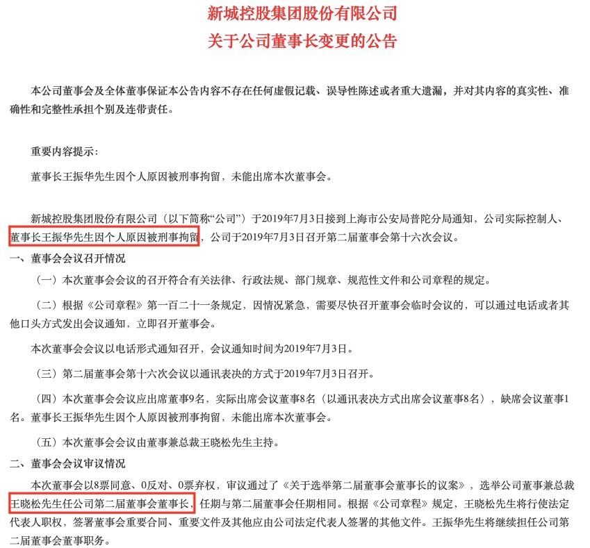 就在7月3日晚间,新城控股火速发布了一则公告,称公司董事长发生变更,原董事长因“个人原因”被刑事拘留,选举公司董事兼总裁王晓松任公司第二届董事会董事长。王晓松是王振华的儿子。