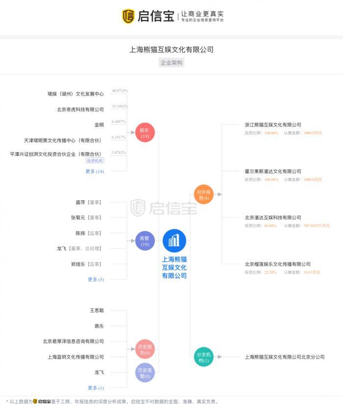 启信宝数据显示,公司的最大股东为由王思聪全资持股的珺娱(湖州)文化发展中心,持股比例40.07%;周鸿祎旗下的北京奇虎科技有限公司则为第二大股东,持股比例19.35%。