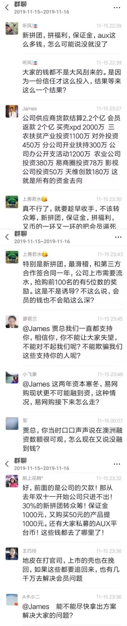 5月20日,易网购又以公司上市需要资金流水为由,开启新的“拼团乐购”(内部称“新拼团”)。贾永龙微信说,买拼团金额前100的人,奖励不低于5位数人民币。吴景玉等高层不停鼓动会员购买,又有部分会员上当。