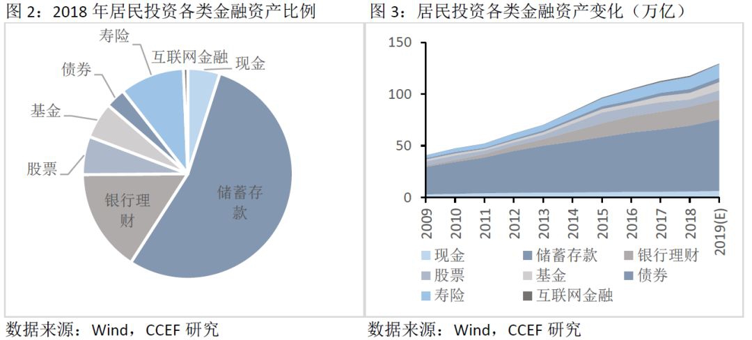 从居民的理财结构来看,储蓄存款是家庭金融资产的配置中占比最大的一块,2018年其总规模达到63.66万亿人民币,占一半;其次是银行理财产品,总规模18.55万亿,占15%左右。若将居民对股票、债券、基金的投资作为统一口径来看,资本市场投资占居民总投资的14.52%,保险投资占10%,现金与互联网理财(P2P)分别占5%和0.67%。