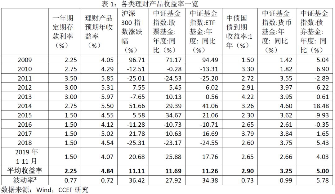 2. 理财产品收益率比较从理财产品收益率来看,2009年至2018年,权益型产品(股票和股指基金)的平均收益率超过了11%,债券基金是平均收益率为5%,银行理财产品的平均收益率4.84%,货币基金,国债和存款的收益率大约在2.25%-3.25%之间。从平均波动性来看,股票及股票指数基金的收益率大起大落,波动剧烈,其次是债券基金,最稳定的是国债、理财产品和定期存款(表1)。