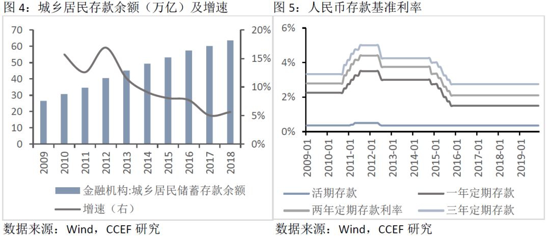 2018年,居民储蓄存款余额为63.66万亿人民币,同比增长5.63%。自2015年11月起,人民币活期存款、一年定期存款、两年定期存款、三年定期存款基准利率一直维持在0.35、1.5%、2.1%和2.75%的低位,尽管收益率和市场上其他理财产品相比不具有竞争力,但作为安全性最高的投资产品,储蓄存款仍是居民理财的最主要渠道,因此其余额也在持续增长。