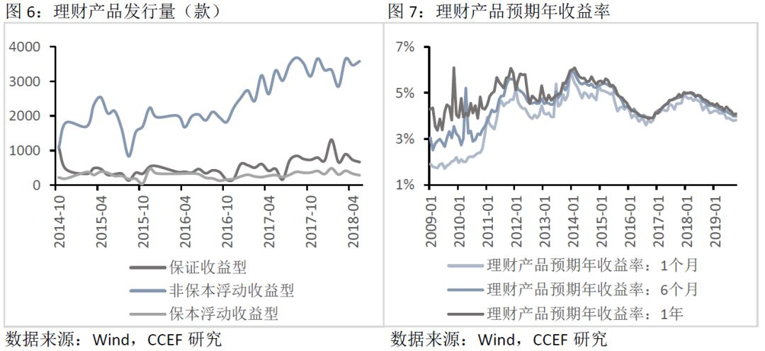 2018是资产管理的元年。中国人民银行、中国银保监会、中国证监会、国家外管局联合印发了《关于规范金融机构资产管理业务的指导意见》,极大规范了银行理财存在的刚性兑付、多层嵌套、期限错配、资产配置频繁调仓等问题。资产管理行业正式进入“严监管”时代。由于银行“不得以任何形式对理财产品进行保本保收益”,新发行产品种中非保本浮动收益型数量已大大上升(图6)。