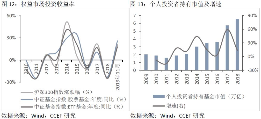 股票市场具有高回报高风险的特点,无论是沪深300指数年度涨跌幅,还是以股票市场为投资对象的股票基金与ETF基金,其投资收益的波动幅度远高于存款、银行理财、保险等理财产品。由于投研能力与风险应对能力相对不足,未来个人投资者或将更多以购买公募的形式参与权益市场的投资。截止2018年底,个人投资者持有的基金市值已达到6.53万亿,接近基金市场的半壁江山。