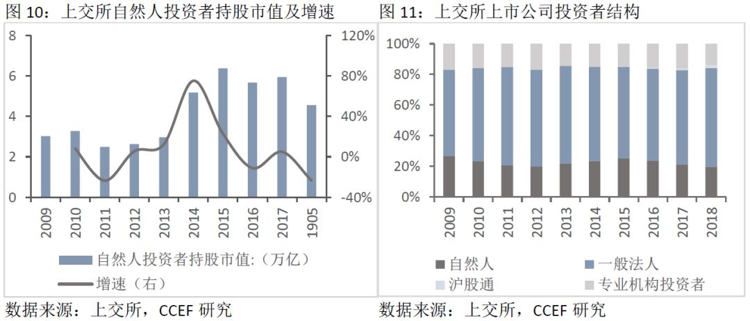 受中美经贸摩擦以及经济增速下滑的影响,2018年股票市值大幅缩水,无论是投资者人数还是投资者所持有市值均出现了下降,根据上交所披露的投资者持股市值,2018年其自然人投资者持股市值由59445亿下降到45506亿元,降幅达23.45%。从投资者占比来看,自然人持股市值占总投资者持股市值的比例由2015的21.17%下降到2018年16.62%。