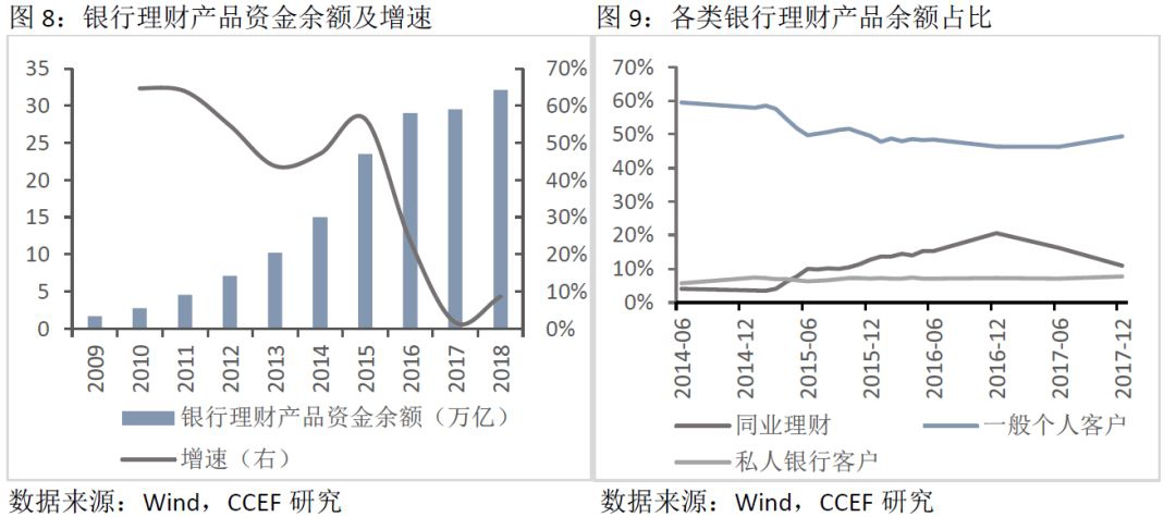 从银行理财产品存续余额来看,2018年银行理财产品同比增长8.67%,总体规模并未受到影响,而同业理财产品自2016年12月达到顶峰59900亿元(20.61%)之后规模与占比出现双降。2018年初,《关于进一步深化整治银行业市场乱象的通知》发布,同业理财受到更加严格的管控。至2018年12月,资金余额仅剩12200亿元,降幅高达79.63%,占总资金余额百分比仅为3.8%。相比之下,个人客户产品占比保持相对稳定,其中一般个人客户产品占比在48%左右,私人银行客户专属产品在7%左右。