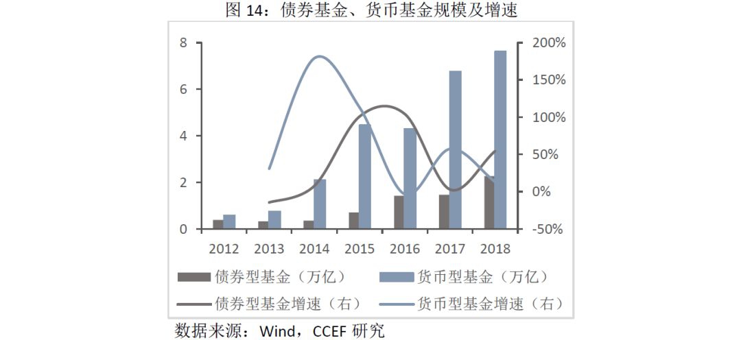固定收益市场通常包括债券、债券基金及货币基金。在债券市场,参与者大多为机构投资者,原因在于:1.债券市场以大额交易为主,个人投资者的资金量很难参与其中;2.债券市场流动性相对较低,个人资金难以灵活周转;3.债券市场与利率变化息息相关,个人投资者很难准确把握宏观经济的走势。因此,目前个人投资者投资债券的方式,大多是购买以债券为标的的基金,既降低了交易风险,同时也能分享债券收益。2018年债券型基金同比增长超过50%,同样发展迅猛的还有货币型基金,其稳定的收益性与良好的流动性对银行存款造成了一定的挤出效应。2018年,货币基金净值已达到7.62万亿,占总公募基金净值的58.44%。