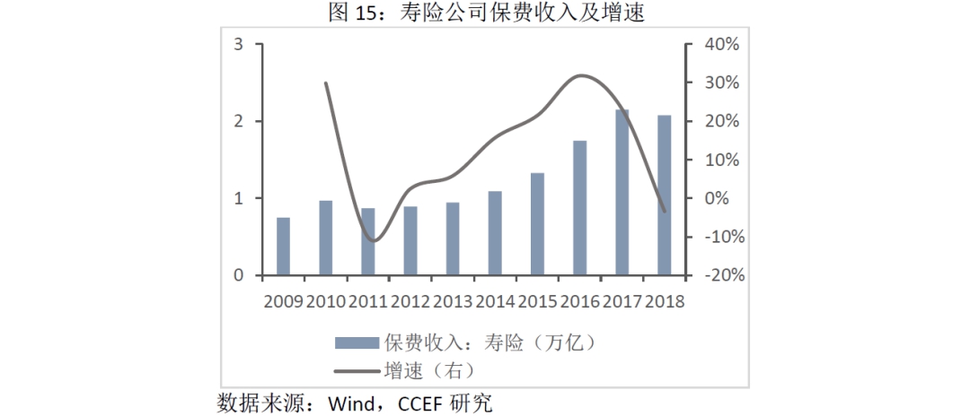 2017年出台的《中国保监会关于规范人身保险公司产品开发设计行为的通知》要求年金保险产品首次生存保险金给付应在保单生效满5年之后,且每年给付或部分领取比例不得超过已交保险费的20%。带有强烈理财色彩的“短交快返”型寿险产品被禁止销售,寿险行业保费收入增速首次出现负增长,2018年保费收入为同比下降3.42%。尽管该通知一定程度上压制了寿险短期保费收入增长,但从长远来看,却有帮助寿险业务回归保值增值功能的意义。