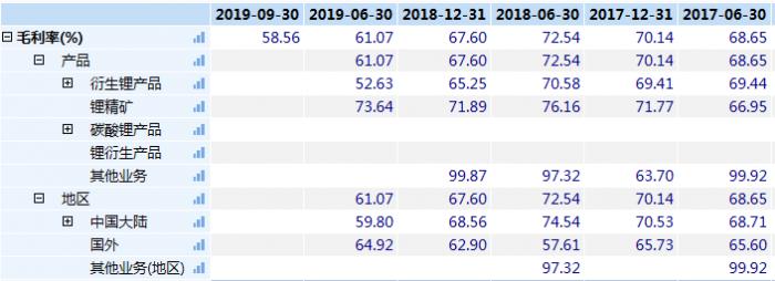 2019年上半年,公司衍生锂产品毛利率为52.63%,较2018年全年仅下降12.62个百分点。