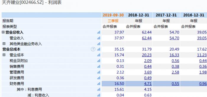 数据显示,2018年天齐锂业财务费用为4.71亿元,但是2019年前三季度该项支出便已经大幅增加至16.5亿元。