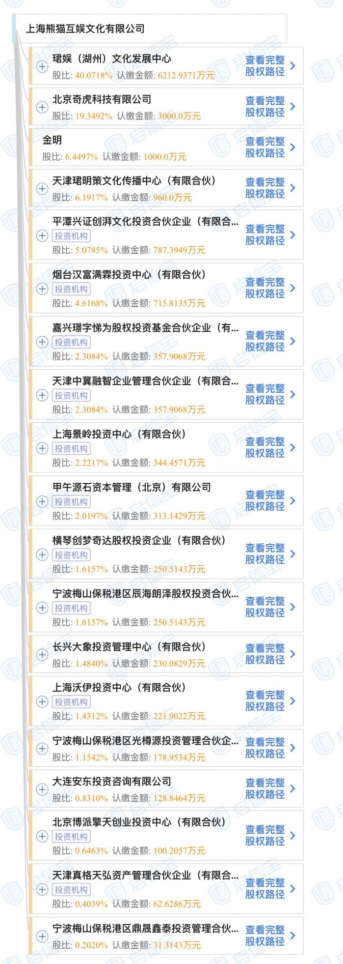 据启信宝数据显示,熊猫互娱的投资方约有19个,其中王思聪通过珺娱(湖州)文化发展中心持股约40%,第二大股东为周鸿祎的北京奇虎科技有限公司,持股比例为19.34%。剩下的股东持股比例均为10%以下,其中,嘉兴璟字悌为股权投资基金持股2.3%。