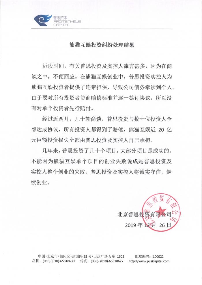 普思资本的公告称,近段时间,有关普思投资及实控人流言甚多,但因为在商谈之中,不便回应。在熊猫互娱创业中,普思投资实控人为熊猫互娱投资者提供了连带担保,导致公司债务牵涉到个人,由于要对所有投资者协商赔偿标准并逐一签订协议,所以没有对单个投资者先行赔付。