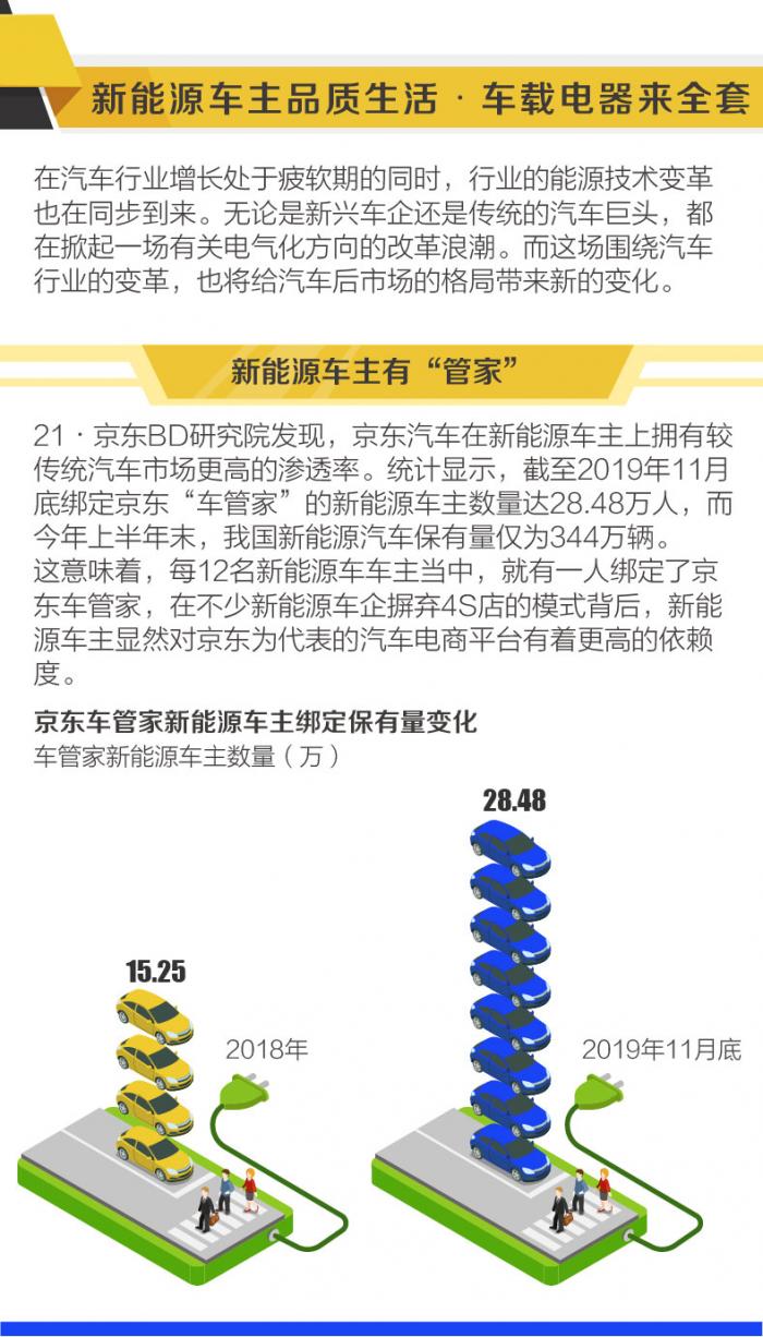 21·京东BD研究院发现,京东汽车在新能源车主上拥有较传统汽车市场更高的渗透率。统计显示,截至2019年11月底绑定京东“车管家”的新能源车主数量达28.48万人,而今年上半年末,我国新能源汽车保有量仅为344万辆。