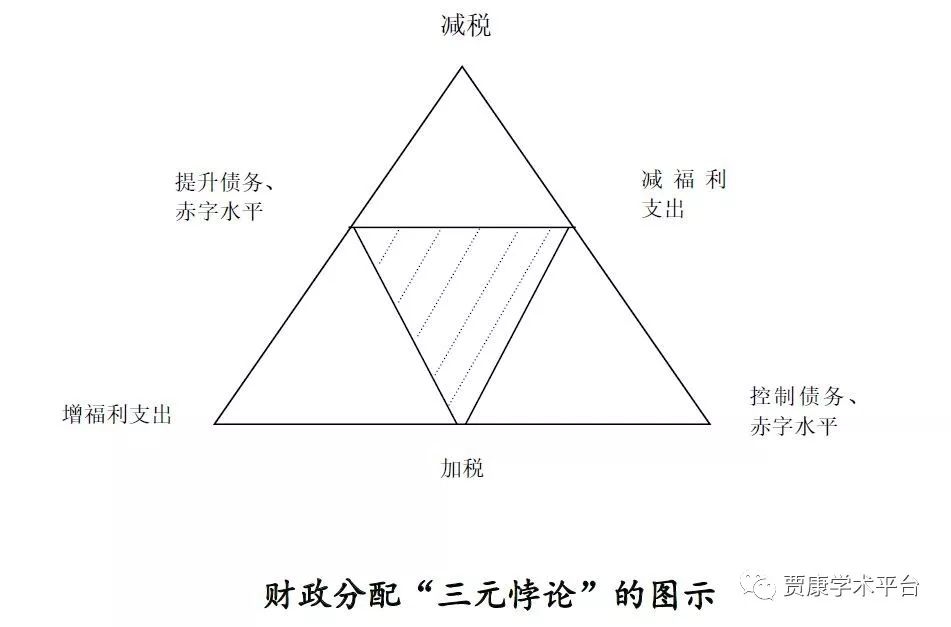 任一特定时期,人们在减少税收、增加公共福利支出和控制政府债务及赤字水平这三个通常看来都“很有道理”的目标之中,其实只能进行以下三种选择:第一,若在财政分配中“减少税收”和“控制债务及赤字水平”,那么必须以减少(而不可能是增加)公共福利支出为前提。第二,若在财政分配中“减少税收”和“增加公共福利”,那么必须通过提升(而不可能是控制)债务及赤字水平来实现。第三,若在财政分配中“控制债务及赤字水平”和“增加公共福利”,那么必须通过增加(而不可能是减少)以税收为代表的政府非债收入来实现。因此,财政分配“三元悖论”,三角形每一顶角上所标目标的实现,必然要求相联两条侧腰线上标出的事项配合,而必然在另外两个顶角上各自标出的目标中违反至少一项。