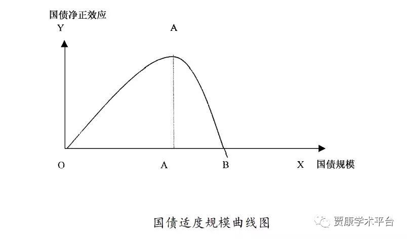 图中,X轴表示国债的规模,Y轴表示国债的净正面效应。在原点O上,没有国债发行,也就不存在国债的外在影响或效应。随国债的发行及其规模的扩大,其净正面效应首先表现为一条Y轴对应值的上升曲线。在曲线达到拐点A以前,国债的净正效应随着国债规模的扩大而增长,到达A点时,国债的净正效应最大化,在其后,随国债规模的继续扩大,其净正面效应反而下降。与拐点对应的国债规模为X轴上的A'点,这一点即为理论上的最佳国债规模,或适度国债规模区间的中点。国债规模超过A'点后,每增加一单位国债,其负效应就会明显增加,从而使国债的总体正效应呈一条下滑曲线,如果超出过多(经过B点后净正效应为负),甚至将造成危机性的后果。