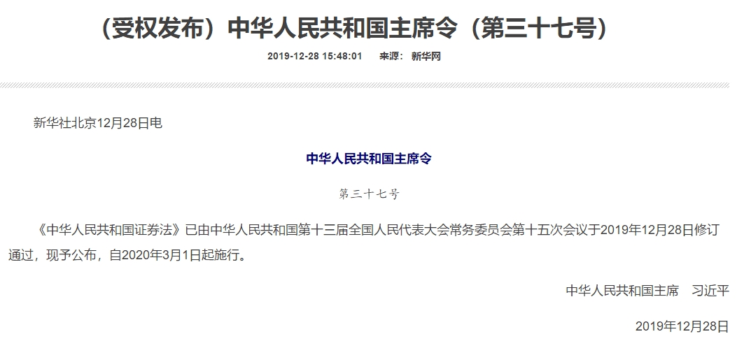 “升级版”证券法来了!12月28日上午,十三届全国人大常委会第十五次会议审议通过了《中华人民共和国证券法》(下称“证券法”)修订草案,经修订的证券法将自2020年3月1日起正式实施。
