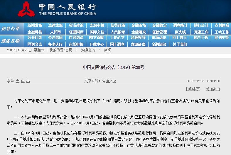 央行周末也不休息,12月28日,央行发布公告称,为进一步深化LPR改革,商业银行应自2020年3月1日起与存量贷款客户正式切换存量浮动利率贷款定价基准,原则上存量贷款利率定价基准切换工作要在2020年8月31日前全部完成。