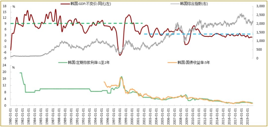 图4:韩国约2000年之后经济增长中枢下移,利率水平下降,股市先后于2007、2011、2018年创新高