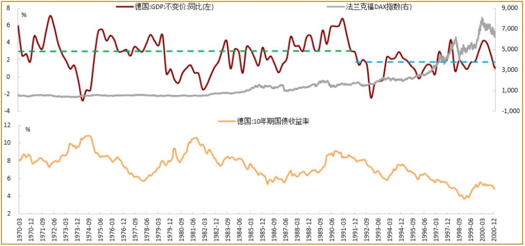 图3:德国于1991年之后经济增长中枢下移,利率水平下降,股市于1998年和2000年两度创新高