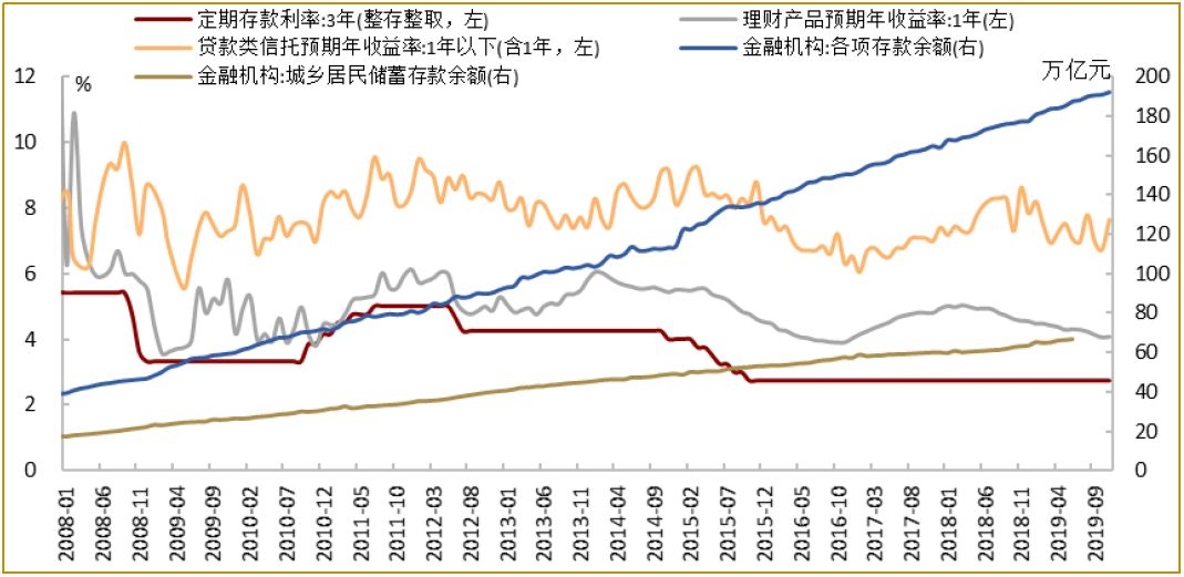 图5:大量社会财富囤积在银行体系中,但过去十年来固收类、理财类产品收益率趋于回落