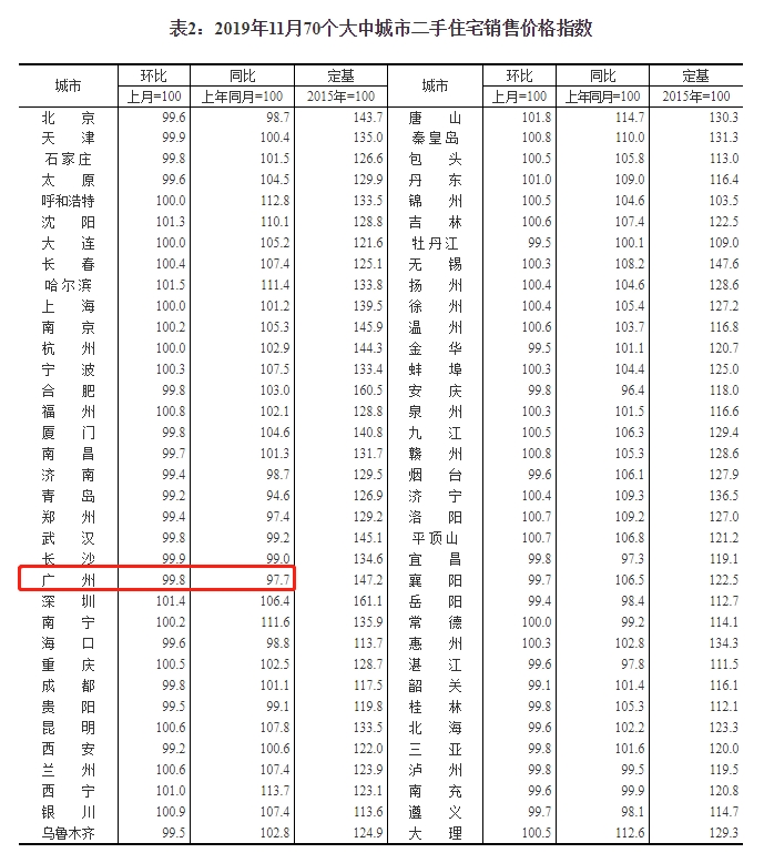 表:据国家统计局发布的《2019年11月份70个大中城市商品住宅销售价格变动情况》和《2019年1-11月份全国房地产开发投资和销售情况》,11月33个城市二手房价格环比下跌。