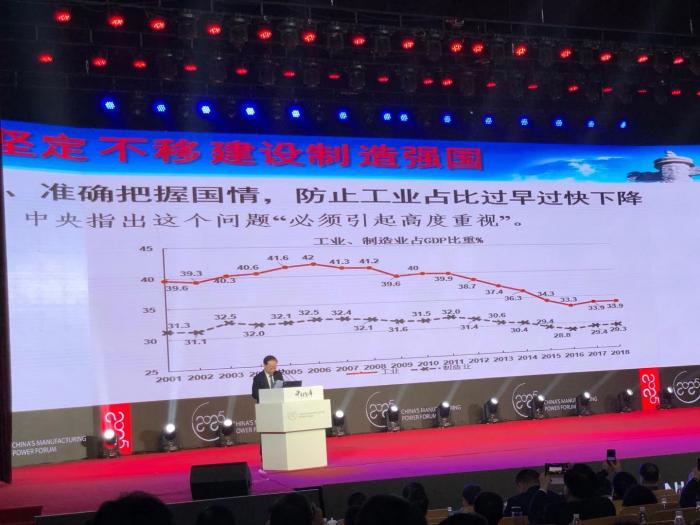 他指出,中国工业占GDP的比例在2006年达到42%的高峰,此后以每年一个百分点的速度一路下跌,到2016年创下33.3%的最低点,应该高度重视制造业占比过快下降的问题,警惕工业被空心化、边缘化的状况。