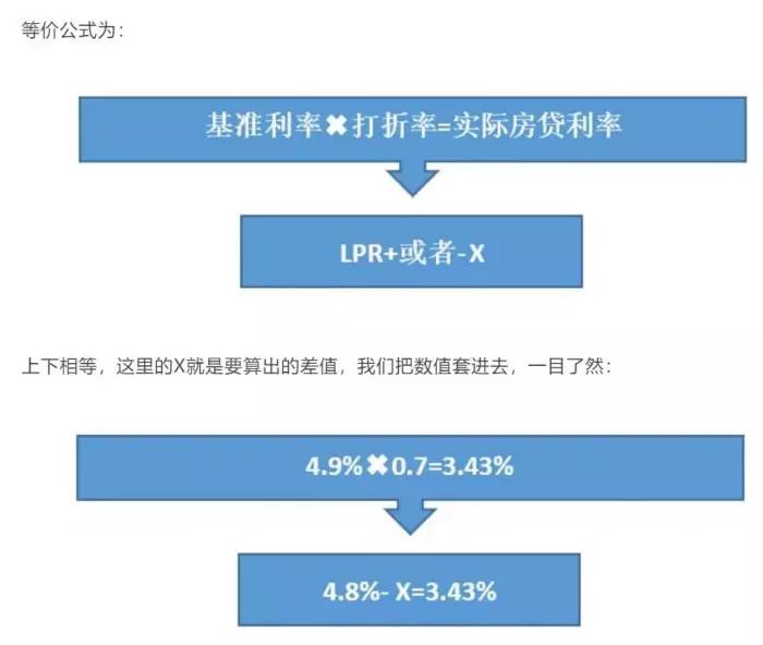 央行要求,在转换时点的利率水平应保持不变,这就催生了一个等价公式。即李小姐之前享受3.43%的房贷利率水平,在明年切换时依然维持3.43%,只是“基准换LPR、折扣换差值”。