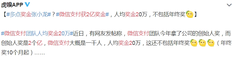 最近,素有“鹅厂”之称的腾讯公司也爆出不少料。比如,微信支付团队拿到2019年公司创始人奖,奖金2个亿,人均奖金20万元,年终奖另外单发(10个月工资起)。