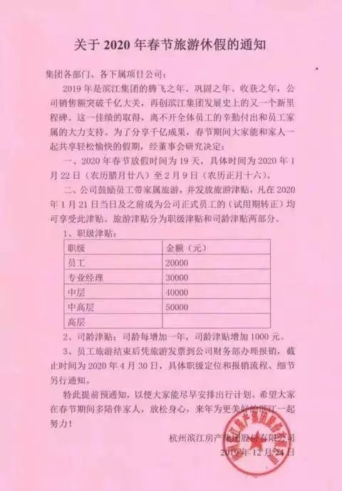 最近,杭州某房地产企业一则通知被曝光后,让众网友羡慕不已。通知称,为分享1000亿成果,决定将2020年春节放假时间定为19天。除此之外,公司还鼓励员工带家属旅游,并给每人发放2万元—5万元的旅游津贴。预计将会发放超4000万元旅游津贴。