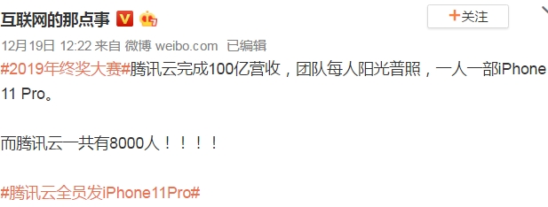 还有,腾讯云完成100亿元营收,团队获得了阳光普照奖,一人一部最新款iPhone 11 Pro手机,该团队一共有8000人!