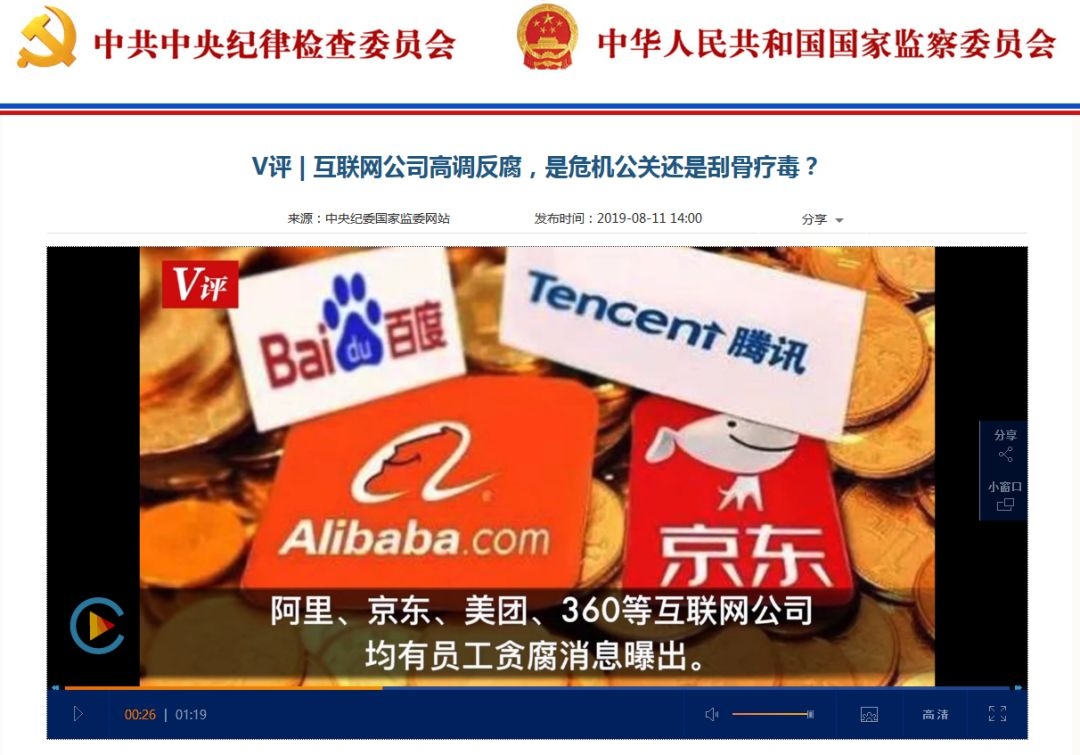 同样,在反腐风暴之下,中央纪委国家监委网站发布短视频,先后提到了百度、小米、阿里、京东、滴滴等数家大型互联网公司的内部反腐成果。并提出问题,“互联网公司高调反腐,是危机公关还是刮骨疗毒?”互联网公司反腐工作受到更多关注。