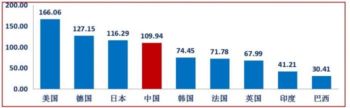 报告显示,中国制造业位居全球第三阵列的前列,在美国、德国、日本之后,名列全球第四名,中国制造强国发展指数为109.94,比去年略有提升,其主要原因是中国规模发展指数(55.16)为近年来最高值且持续位居各国首位,但质量效益(15.05)、结构优化(23.40)、持续发展(16.33)仍与美、德、日等国差距巨大,其中美国在这三项上的指数分别为:49.84、48.77、31.33。
