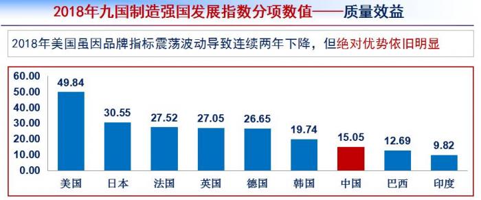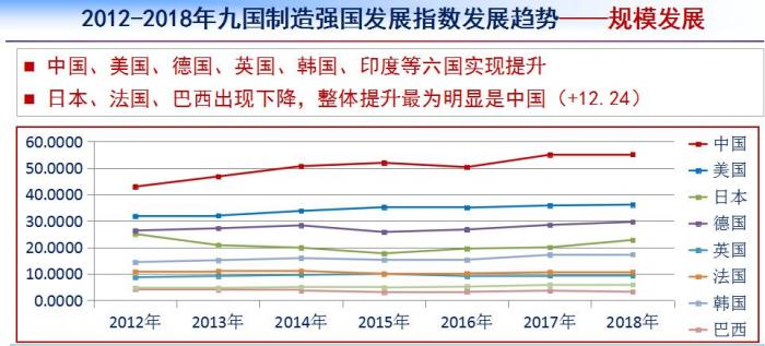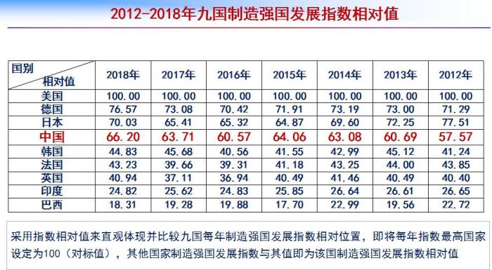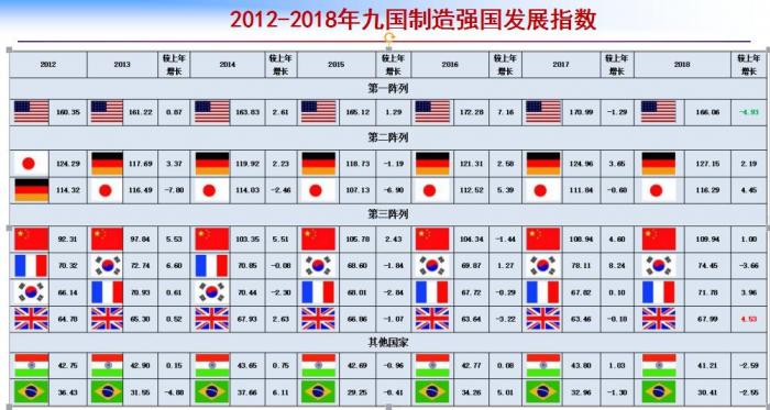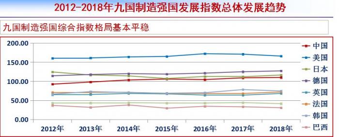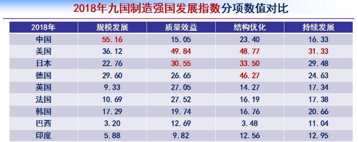 而《2019中国制造强国发展指数报告》基于世界银行、世界贸易组织等权威机构的最新数据,建立并应用制造强国评价指标体系测算了美国、德国、日本、英国、法国、韩国、印度、巴西和中国九国2018年度制造强国综合指数。