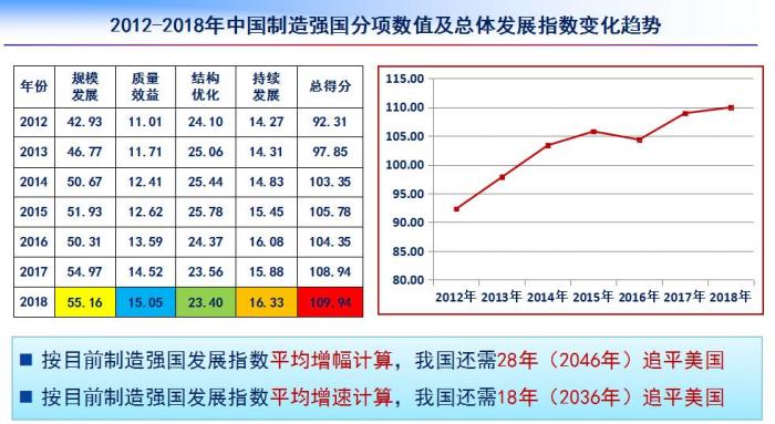 报告认为,按目前制造强国发展指数平均增幅计算,中国还需28年(2046年)追平美国;而按目前制造强国发展指数平均增速计算,中国还需18年(2036年)追平美国。