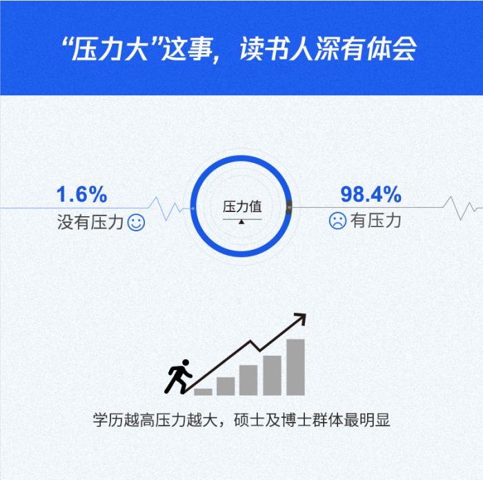 具体来看,98.4%的90后认为生活有压力,且压力指数与学历成正比,学历越高的90后压力越大,硕士及博士成为90后中最“高压”的人群。
