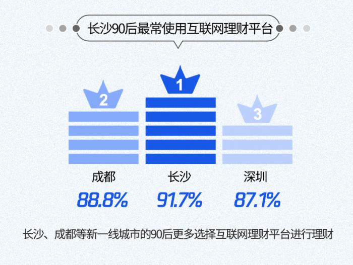 城市方面,长沙、成都等新一线城市的90后更偏好通过互联网进行理财,如选择互联网理财平台的长沙90后占比高达91.7%。