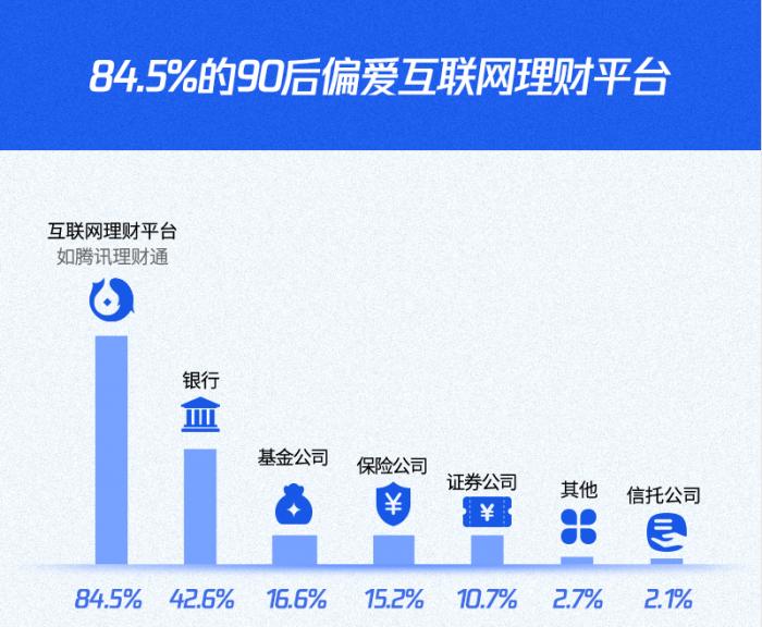 报告显示,84.5%的90后选择了互联网平台,远远高出选择银行等传统理财渠道的比例。