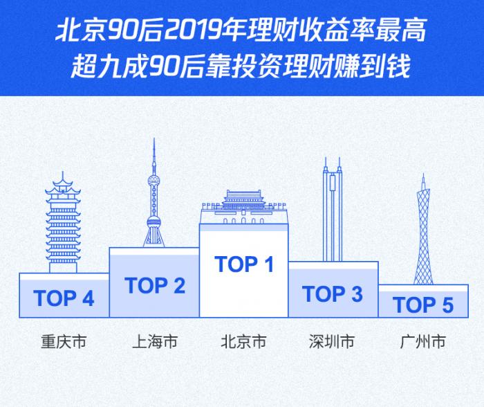 从城市地域分布来看,一线城市的90后理财收益明显更高。例如,北京是90后平均理财收益率最高的城市,紧跟其后的是上海、深圳、重庆、广州。