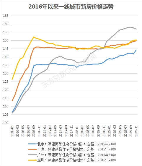 至于新房,同样看4个一线城市,“9·30”新政后北京、上海、深圳新房价格得到遏制,广州直到2017年年中才出现拐头。此后,一线城市新房价格均有所抬头,但广州明显更快,最近广州则出现了明显拐头。