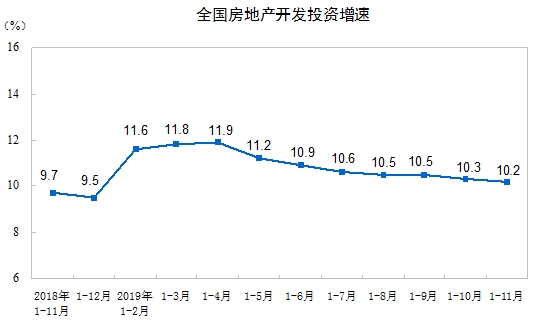 数据显示,2019年1-11月全国房地产开发投资额累计同比增10.2%,较1-10月增速继续收窄0.1个百分点,几乎是连续7个月增速收窄。