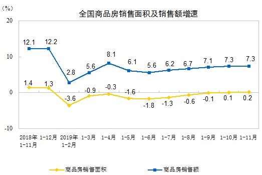 前11个月,商品房销售面积148905万平方米,同比增长0.2%,增速比前10个月加快0.1个百分点。而前11个月商品房销售额139006亿元,增长7.3%,增速较前10个月持平。