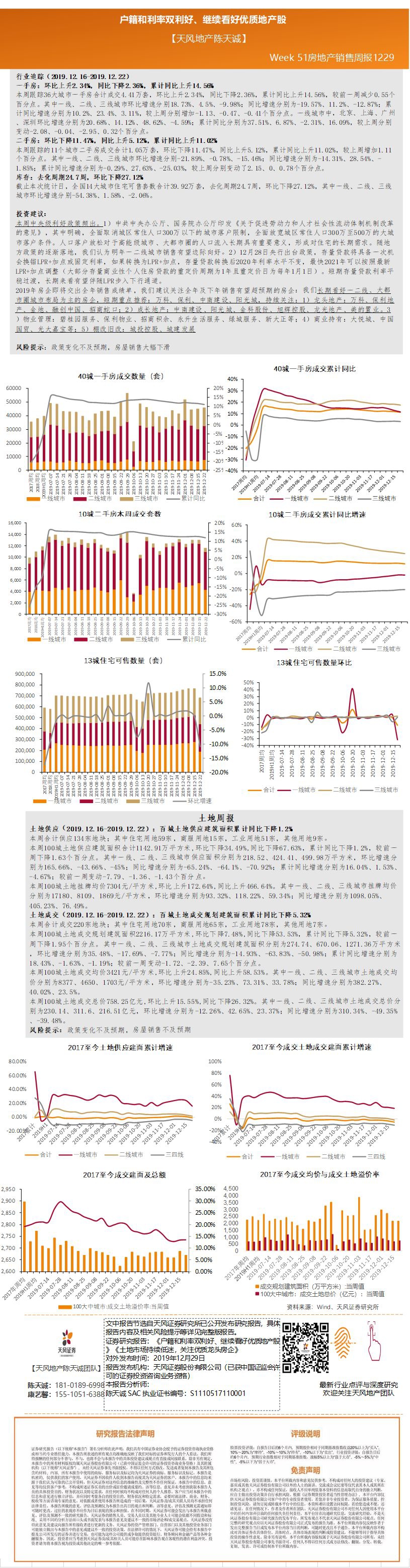 本周中央级利好政策频出。1)中共中央办公厅、国务院办公厅印发《关于促进劳动力和人才社会性流动体制机制改革的意见》,其中明确,全面取消城区常住人口300万以下的城市落户限制,全面放宽城区常住人口300万至500万的大城市落户条件。人口落户放松对于高能级城市、大都市圈的人口流入长期具有重要意义,形成对住宅的长期需求。随地方政策的逐渐落地,我们认为明年一二线城市销售有望边际向好。2)12月28日央行出台政策,存量贷款将具备一次机会换锚LPR+加点或固定利率,如果转换为LPR+加点,存量贷款转换后2020年利率水平不变,最快2021年可以按照最新LPR+加点调整(大部分存量商业性个人住房贷款的重定价周期为1年且重定价日为每年1月1日)。短期存量贷款利率平稳过渡,长期来看有望伴随LPR步入下行通道。